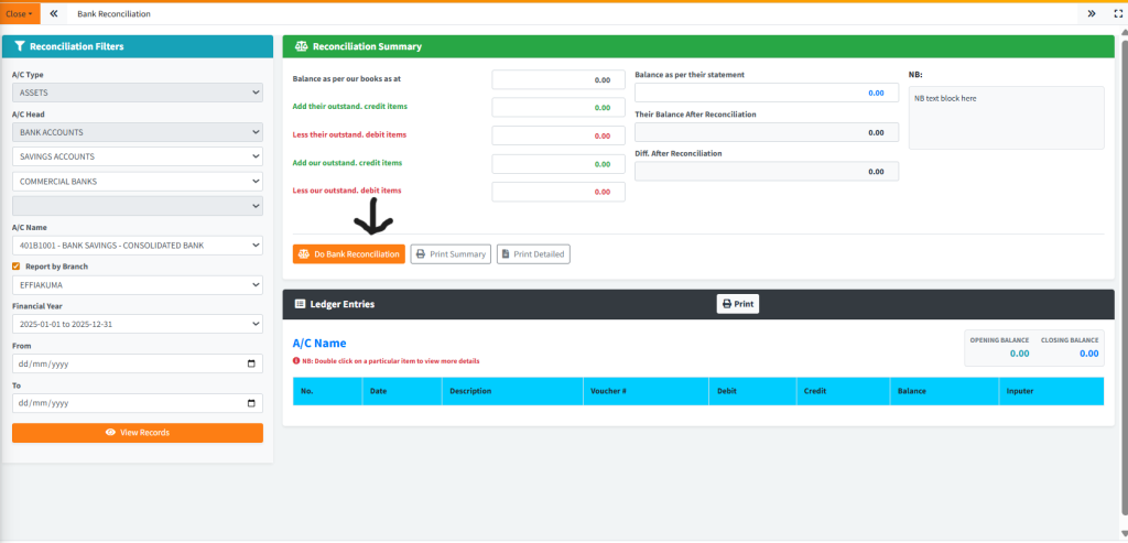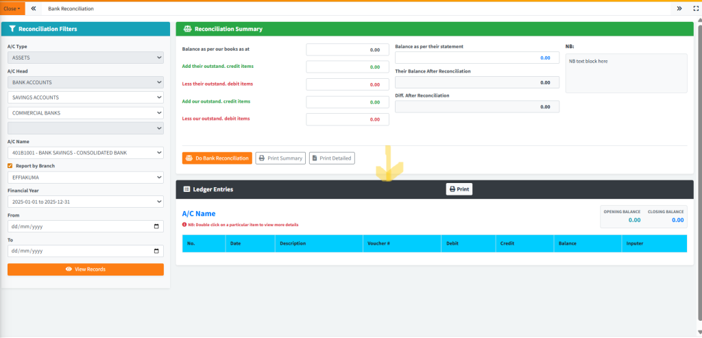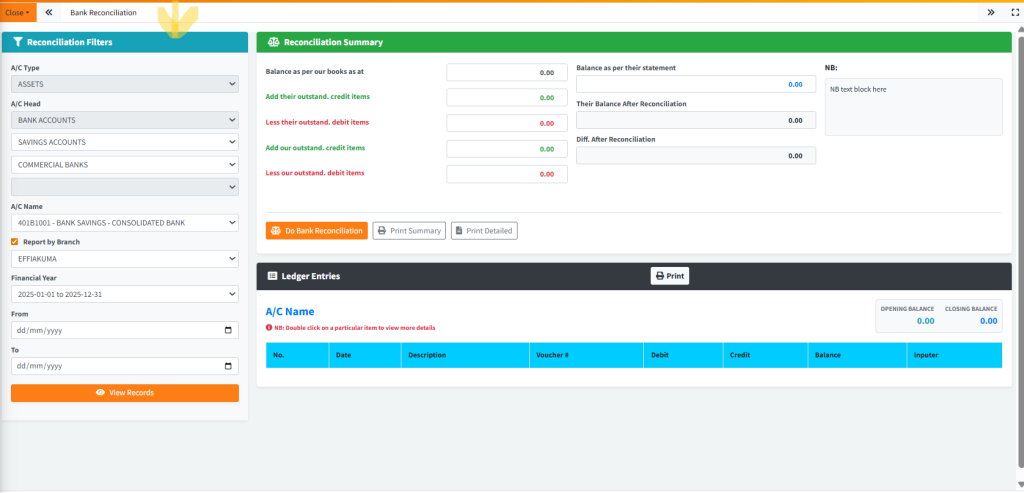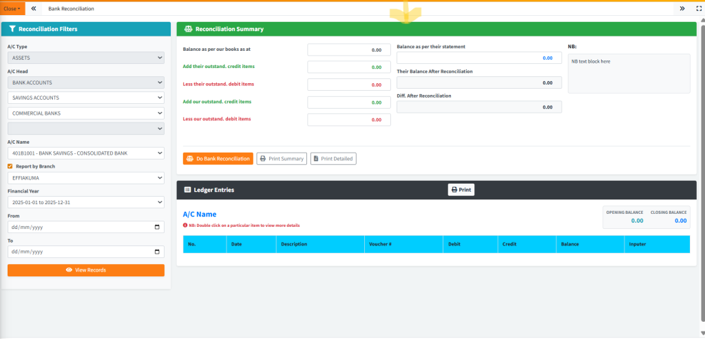 The Bank Reconciliation module provides financial administrators the tools to systematically compare internal financial records against external bank statements. It features an intuitive, dual-panel layout where users can filter down to specific bank ledgers on the left and immediately interact with live reconciliation summaries and ledger entries on the right. This ensures all cash book balances match the actual funds held at correspondent banks.