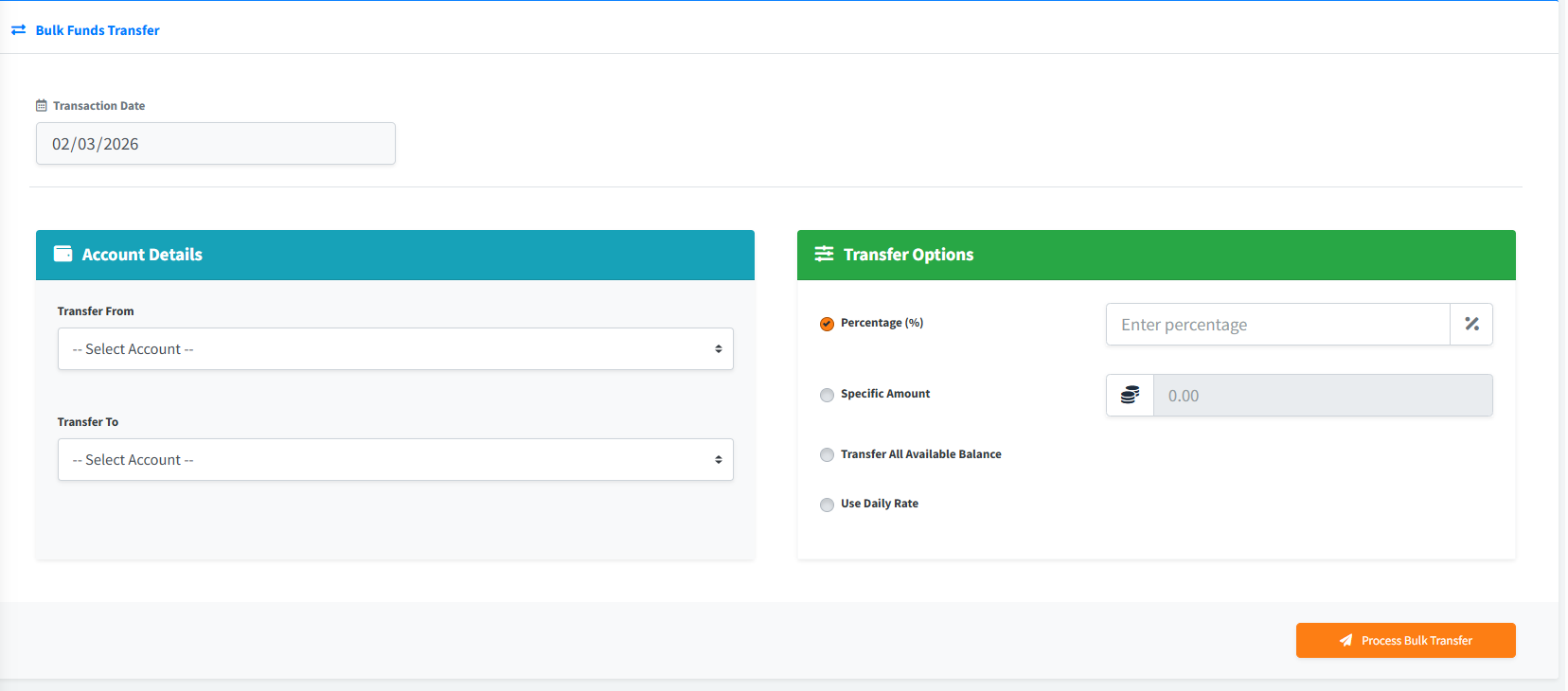 The Bulk Funds Transfer module is a powerful administrative tool that allows users to move funds simultaneously across all customer accounts from one product type to another. Instead of transferring money manually for every single customer, this utility automates the process across the entire institution based on flexible criteria such as specific percentages, exact amounts, total available balances, or dynamically via daily rates.