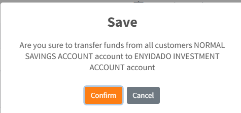 - A critical warning prompt will appear: “Are you sure to transfer funds from all customers [Source] account to [Destination] account”.