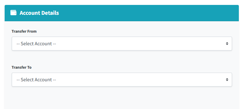 - Transfer To: Use the dropdown menu to select the destination deposit product. Funds will be deposited into the corresponding customer accounts for this product. (Note: You cannot select the identical product for both fields).
