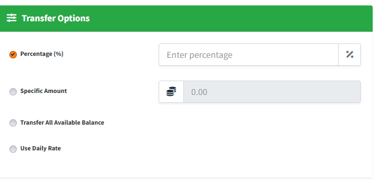 - Percentage (%): Select this radio button to transfer a specified percentage. The percentage input field will unlock. Type the number (e.g.,
