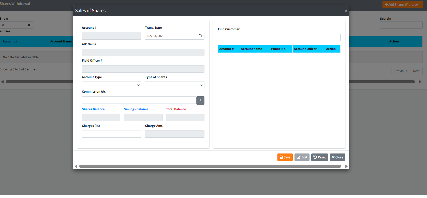 The Shares Withdrawal module allows administration to formalize and process the withdrawal or liquidation of a member’s shares. Due to the sensitive nature of share liquidation in cooperative frameworks, this page calculates the maximum available share balances, compares them against any outstanding loan/savings balances, and safely applies necessary processing commissions to a specified general ledger account before finalizing the withdrawal.