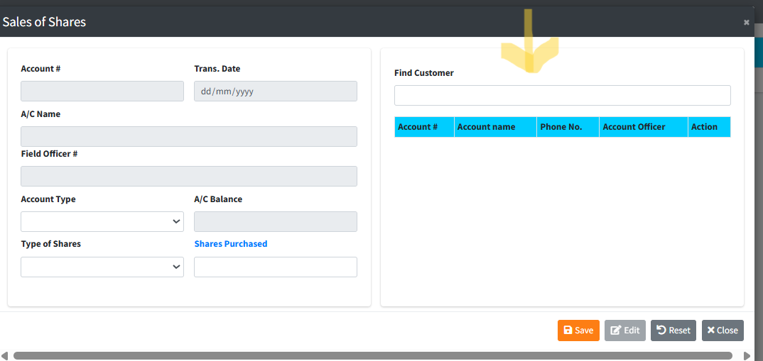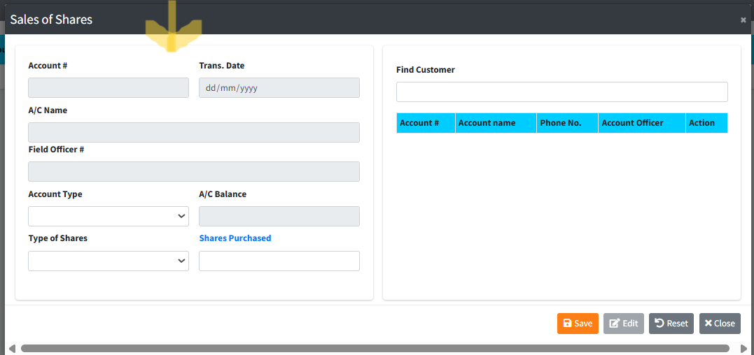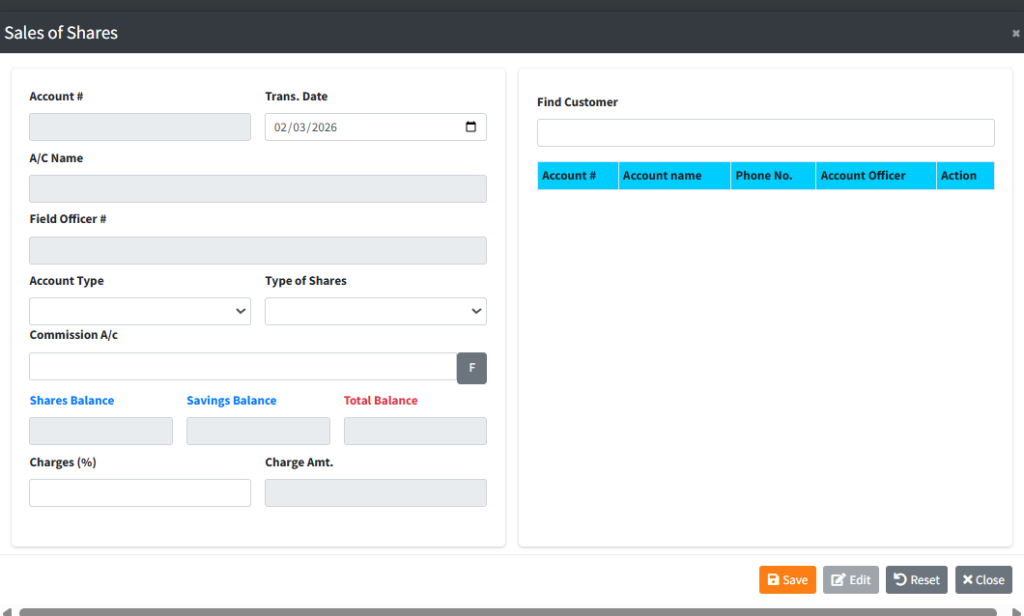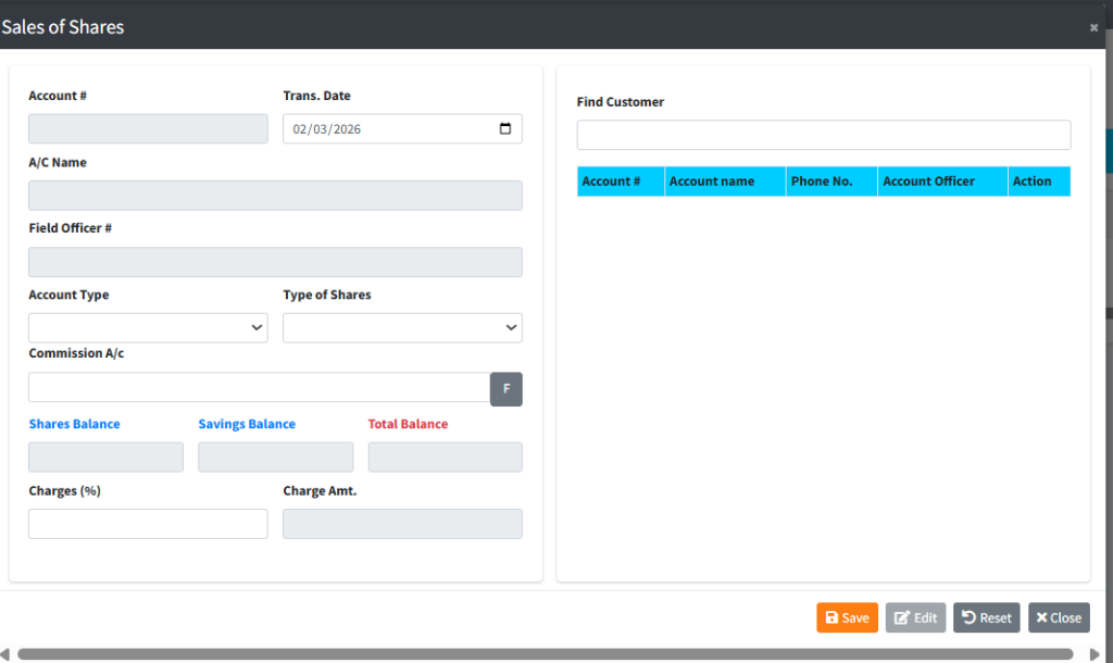 - A large modal titled Sales of Shares will appear. This modal is split into two working sides: the left side handles the transaction metrics, and the right side handles customer lookup.