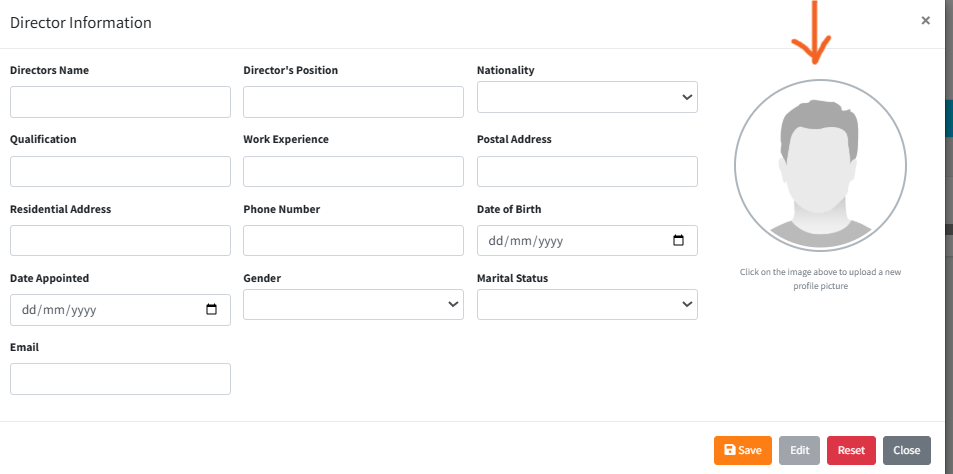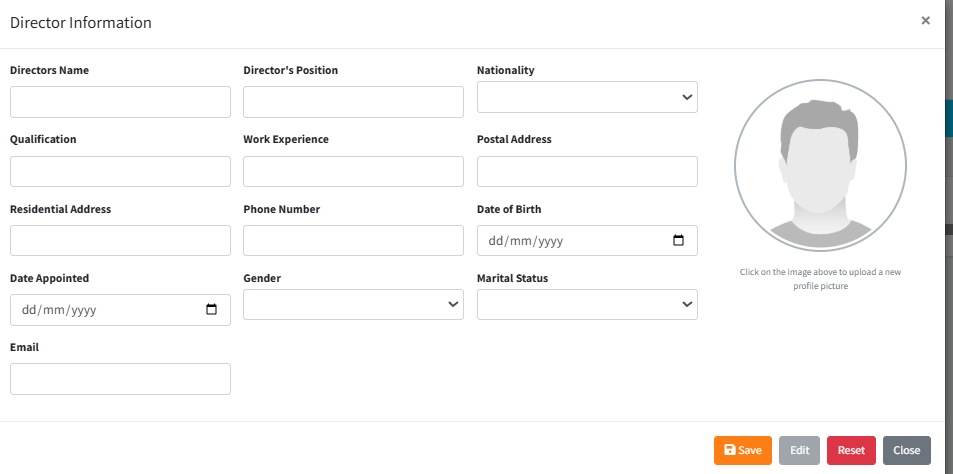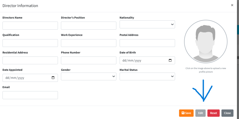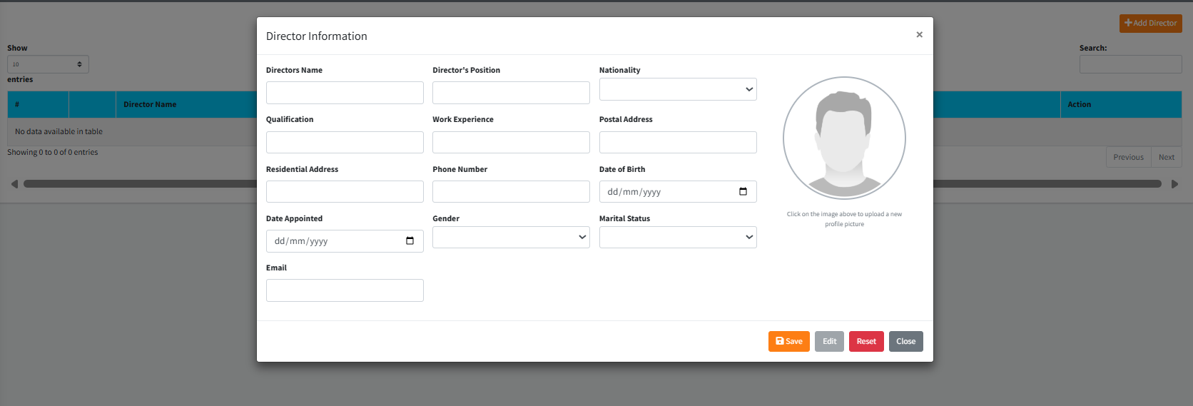 - Once all mandatory fields and the profile picture have been provided, click the blue Save button in the modal footer to register the director.