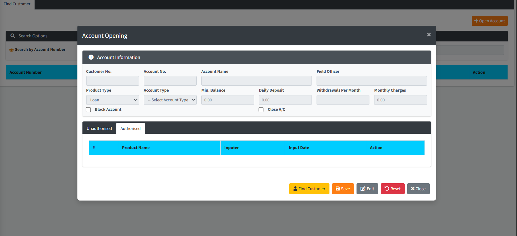 - System Action: Once the Account Type is selected, the system will auto-populate the Min. Balance, Monthly Charges, and Withdrawals Per Month fields based on the institutional settings.
