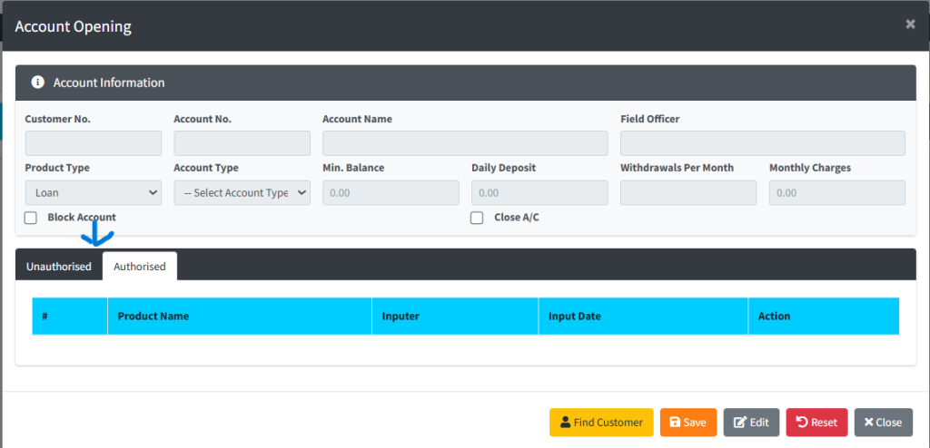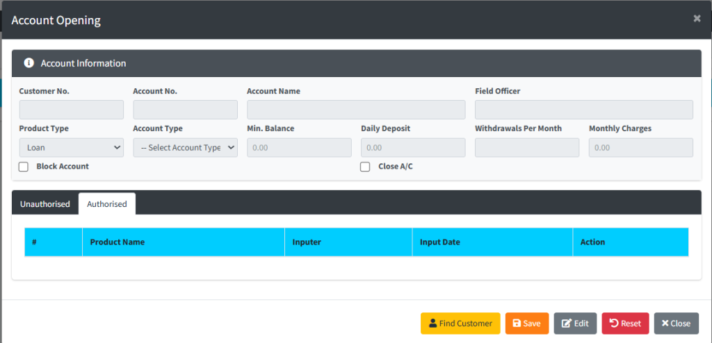 The Account Opening module is the secondary stage of the onboarding process. Once a customer has been registered in the system (KYC), this module is used to link them to specific institutional products—such as Savings, Susu, Loans, or Fixed Deposits. This action generates a unique, functional Account Number that governs how funds are deposited, withdrawn, or charged interest based on the product’s predefined financial rules.