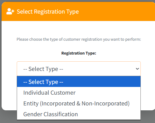 - A selection modal will appear. Choose between Individual Customer, Entity, or Gender Classification.