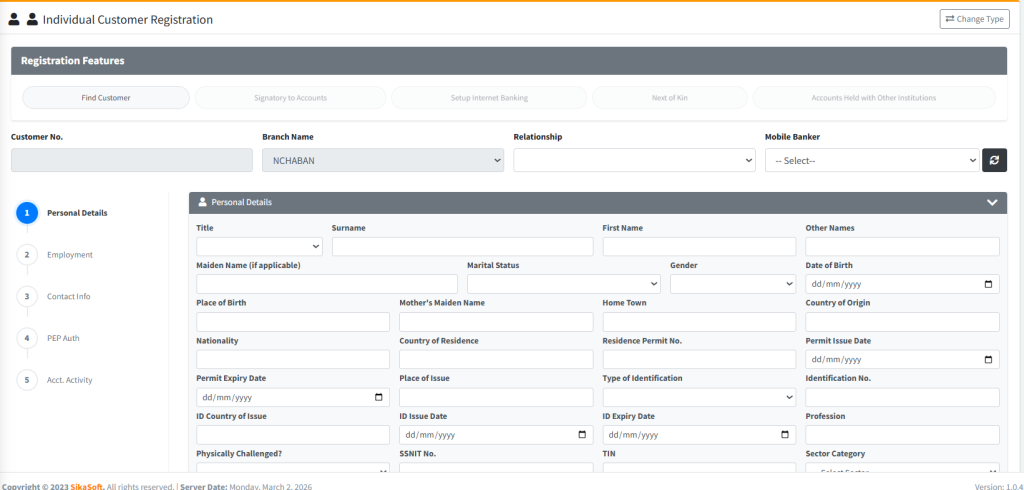 - Branch Locking: Customers are automatically linked to the branch of the officer performing the registration, but can be managed centrally if authorized.