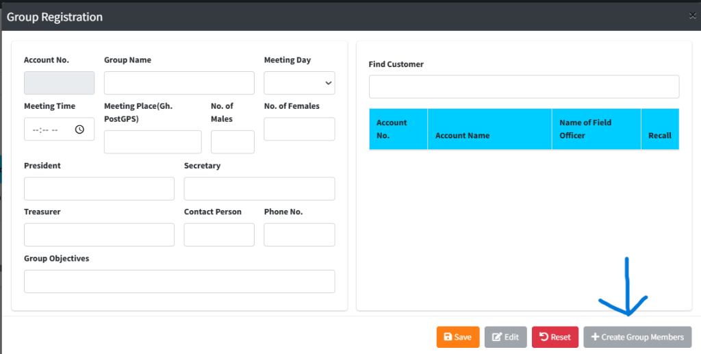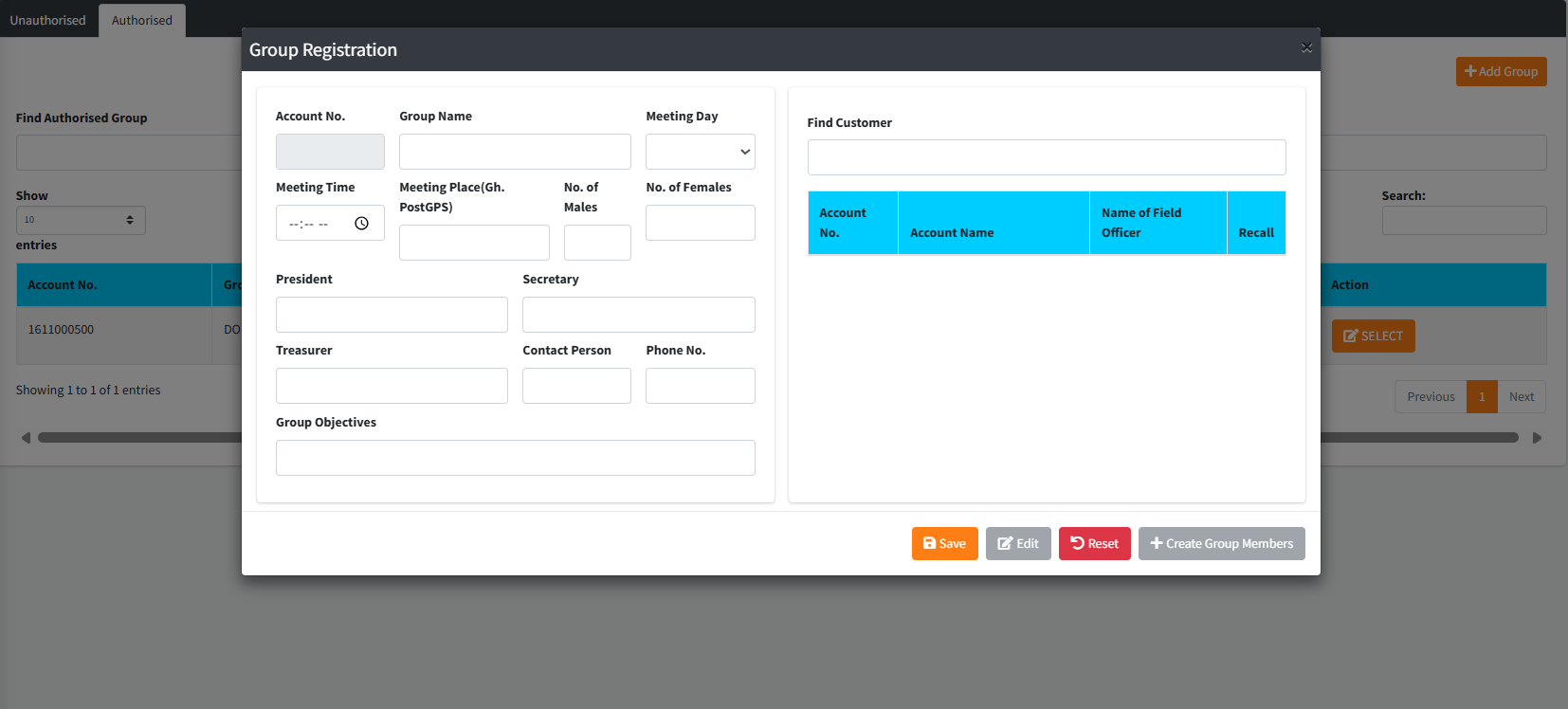 - Pre-requisite: Every group member must first be registered as an Individual Customer through the standard Registration module before they can be added to a group.