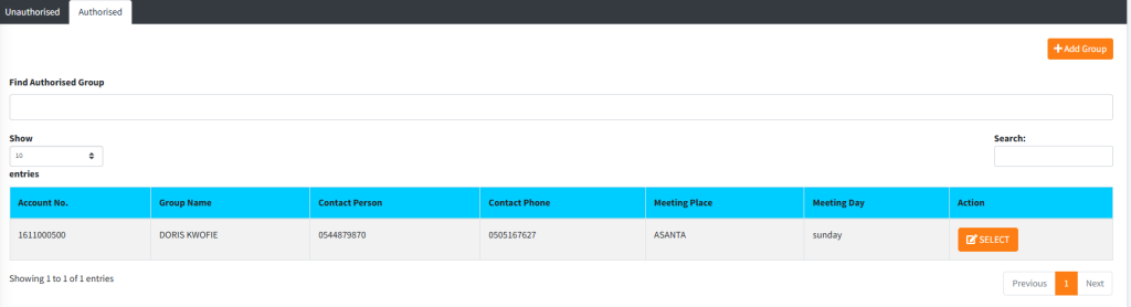 - The dashboard displays Authorised and Unauthorised tabs for managing group statuses.