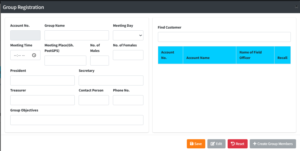 The Group Registration module is designed for the management of collective financial entities such as Susu groups, cooperatives, trade associations, or social clubs. This module allows the institution to register a “Group” as a single administrative unit while maintaining linked records of all individual members. It captures vital operational data including meeting schedules, leadership hierarchies (President, Treasurer, etc.), and group objectives, facilitating specialized group-based lending or savings schemes.